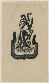 Nagi mężczyzna grający na lirze, siedzący na pniu drzewa. Pod rysunkiem wije się czarna wstęga, na niej napis. ; drzeworyt ; 13,7x8 cm.