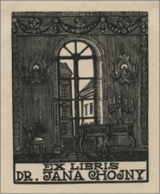 Podpis autora na rewersie ; Wnętrze pokoju ze stylowym biukiem i fotelem, po środku okno z widokiem na ulicę miasta. Na biurku i na ścianach kandelabry. ; 11,5x9,3 cm. ; drzeworyt ; 1 grafika (ekslibris)