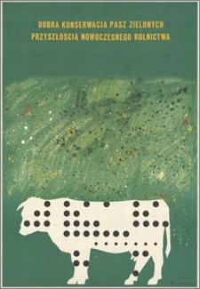 Informacje o drukarni na dole po prawej stronie ; Na zielonym tle po środku pole z kolorowymi kropkami, u dołu biała krowa w czarne kropki, napis u góry ; 58x84 cm. ; druk kolorowy ; 1 plakat