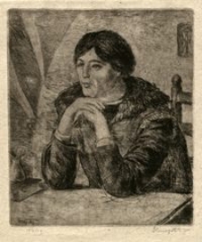 Mikołaj Kopernik siedzący przy stole, podparty pod brodą. ; sucha igła; 15,7x13,5 cm.